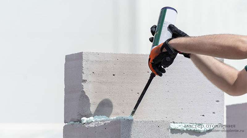 Современная технология предполагает использование специальных клеевых составов — так называемой пенополиуретановой или монтажной пены (клей-пены) для укладки пеноблоков. В отличие от традиционного цементного раствора, клей-пена обладает рядом преимуществ: